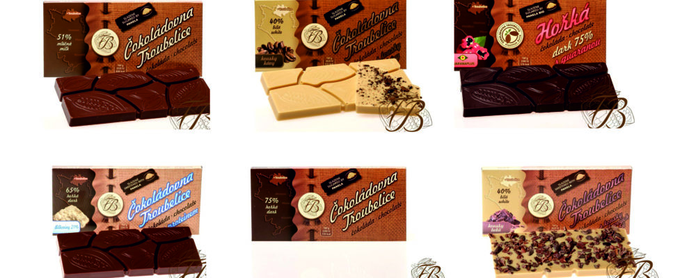 Čokoláda z Troubelic je ručně vyrobená a každá je svým způsobem originál. K výrobě používáme kakaové boby, kakaovou hmotu, kakaové máslo a panelu. Do mléčných a bílých čokolád přidáváme sušené mléko. Naše výrobky neobsahují látky určené k aromatizaci, lecitin ani rostlinné oleje (vyjma kakaového másla). Čokolády jsou slazeny panelou, ztuhlou šťávou z cukrové třtiny, která je zdravou variantou slazení. Dnes máme v nabídce několik druhů čokolád – bílé, mléčné, hořké a 100%. V naší nabídce najdete i dárkové balení čokolád, čokolády s reliéfem, čokolády se sušeným ovocem a ořechy…